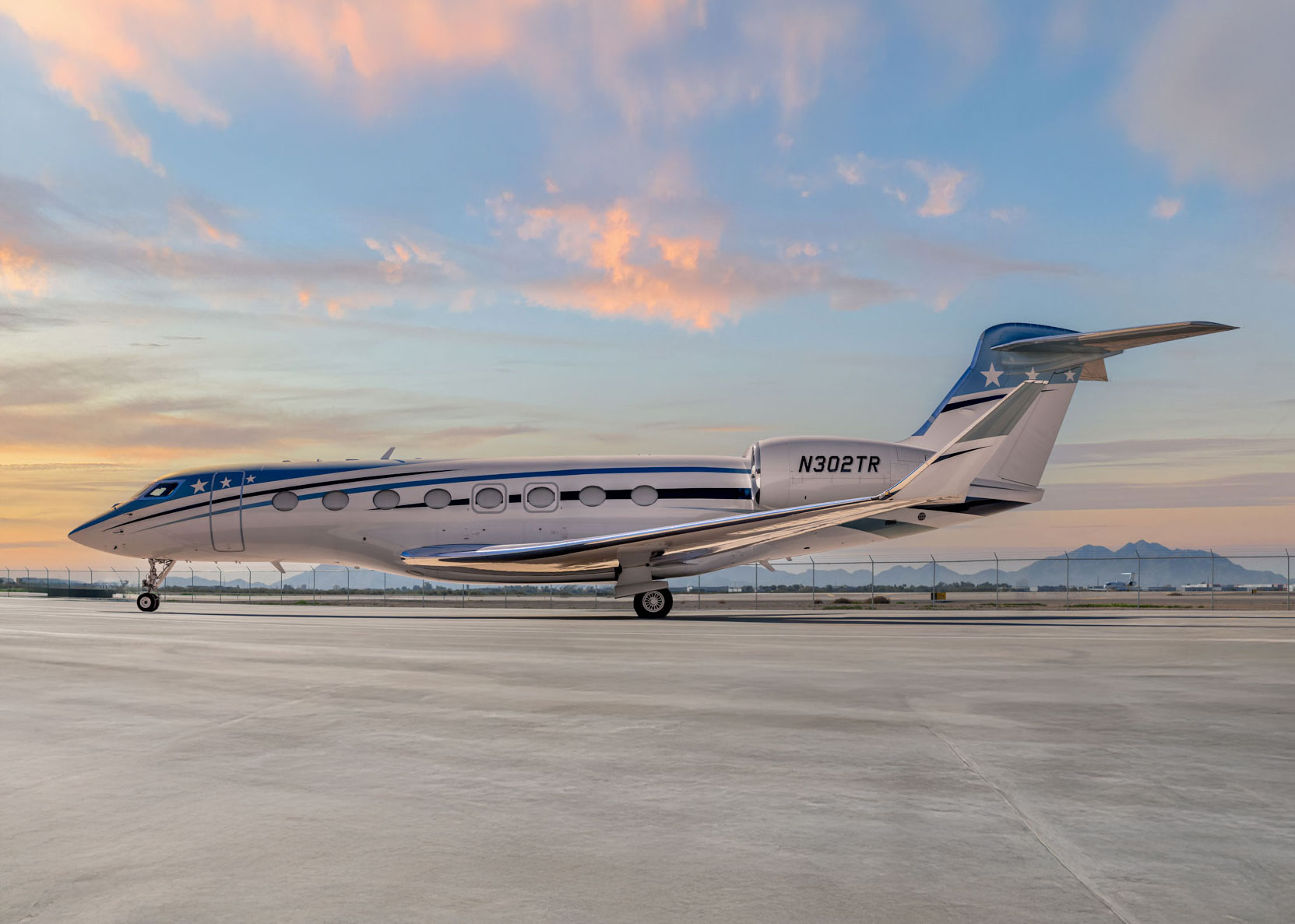 Gulfstream G650 charter aircraft on the ramp at Mesa Arizona during twilight, photographed at Gulfstream MRO with soft evening light and desert backdrop
