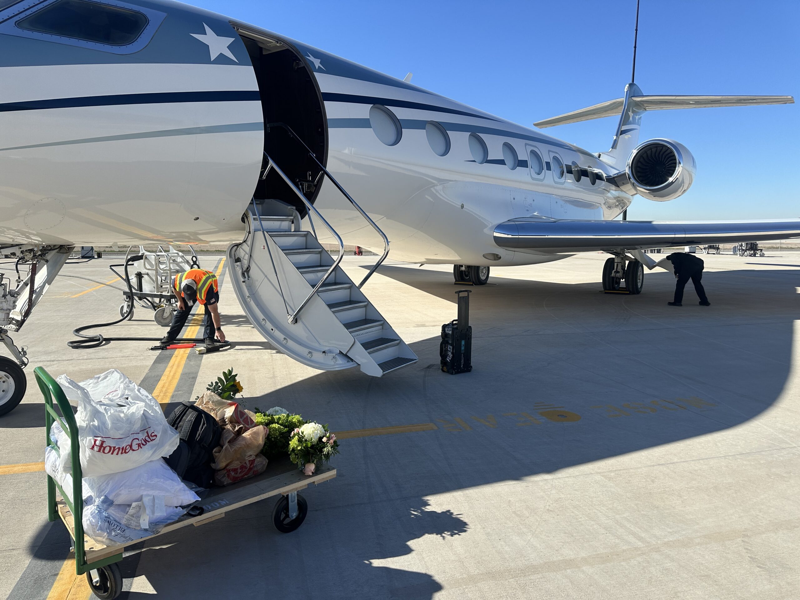 Floral arrangements, pillows, and luxury staging items on a cart outside a Gulfstream G650 aircraft during charter photo shoot prep in Mesa, Arizona.